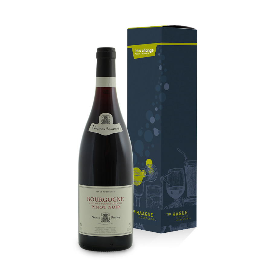 Luxueuze wijndoos met een heerlijke wijn uit Frankrijk: Nuiton-Beaunoy Bourgogne Pinot Noir (0.75L). De doos is speciaal gemaakt in de bedrijfsstijl.