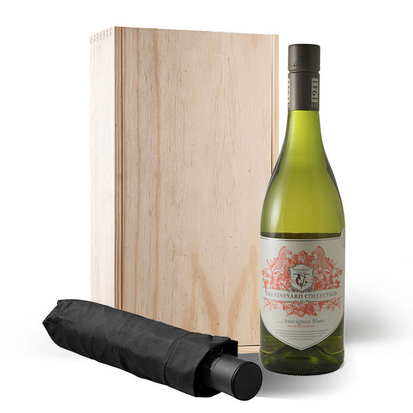 Wijnkist met wijn en een opvouwbare paraplu. drink & dry’. Mooie witte wijn uit Zuid-Afrika: Perdeberg The Vineyard Collection Sauvignon Blanc & opvouwbare automatische paraplu.