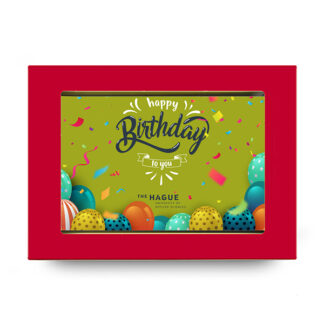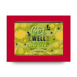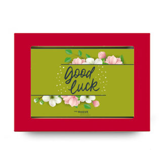 Een rode vensterdoos voorzien van een melkchocolade wenskaart (150 gram) en een marsepeinen laagje (25gram) met de tekst GOOD LUCK en jouw bedrijfslogo. Het marsepeinen laagje wordt met cacaoboter bevestigd op de melkchocolade, waardoor het geschenk één geheel wordt. De chocolade is gemaakt van onze eigen duurzame (Cocoa Horizons) chocoladerecepten van het Belgische topmerk Barry Callebaut.