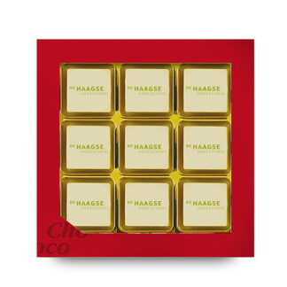 Red giftbox with 9 logo pralines | Handmade pralines of Cocoa Horizons-Certified white chocolate from the Belgian top brand Barry Callebaut, richly provided with a high-quality hazelnut praline filling | In full color we can print any design, image or logo | More than 1 logo per giftbox: + 10% fee |Order quantity > 9.600 pieces, price on request | Available in multiples of 60 pieces | Fast delivery | Personalized box possible from 500 pieces | Setup costs for free!