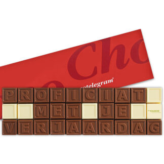 The chocolate squares are made of the finest Belgian chocolate (Cocoa Horizons-Certified from the top brand Barry Callebaut), milk, white and/or dark couverture | With 1 row of 7 characters you can create your own sweet message | The Chocotelegrams are packed in a luxurious red gift box | Order quantity  > 5.000 pieces, price on request | Available in multiples of 40 pieces | Fast delivery | Available in bulk delivery at 1 address or sent individually to multiple addresses