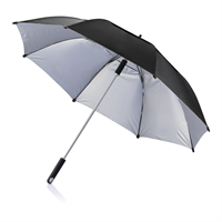 Paraplu met 210T polyester bespanning. Metalen steel en doppen, fiberglass baleinen, pp punt en handvat. Met automatisch open en- sluitsysteem.