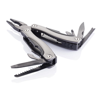 Set bestaande uit een roestvrijstalen multitool met 14 functies en geanodiseerd aluminium handvat en een aluminium zaklamp met 9 witte LED’s.